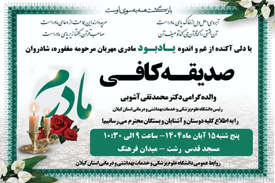 مراسم یادبود مرحومه حاجیه خانم صدیقه کافی والده مکرمهی دکتر محمد تقی آشوبی رئیس دانشگاه علوم پزشکی گیلان در مسجد قدس رشت پنجشنبه ۱۵ آبان از ساعت ۹ الی ۱۰:۳۰ صبح برگزار میگردد.